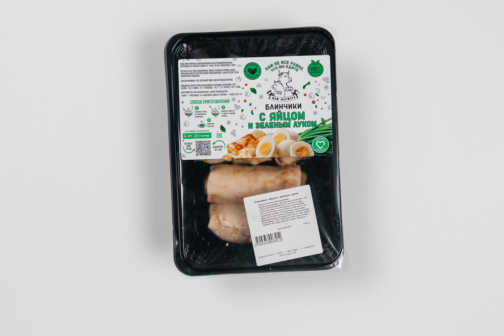 Изделия блинные фаршированные быстрозамороженные. Изготовлен в соответствии с ТУ 10.85.19-052-0148277861-2024. Состав теста: мука пшеничная, яйцо столовое куриное, вода питьевая, масло растительное подсолнечное, сахар-песок, соль поваренная пищевая. Состав начинки: лук зеленый, яйцо, масло подсолнечное. Пищевая и энергетическая ценность (средние значения) 100 г: белки - 16,2 г,жиры - 9 г, углеводы - 19,2 г.; 221,8 ккал / 927,1 Кдж. Условия хранения -18С, срок годности 3 месяца. Вопросы и претензии по качеству продукции принимаются по эл.адресу: control_moymyasnoy76@mail.ru и телефону +7(4852) 700-110.Способ приготовления: приготовление на усмотрение потребителя.